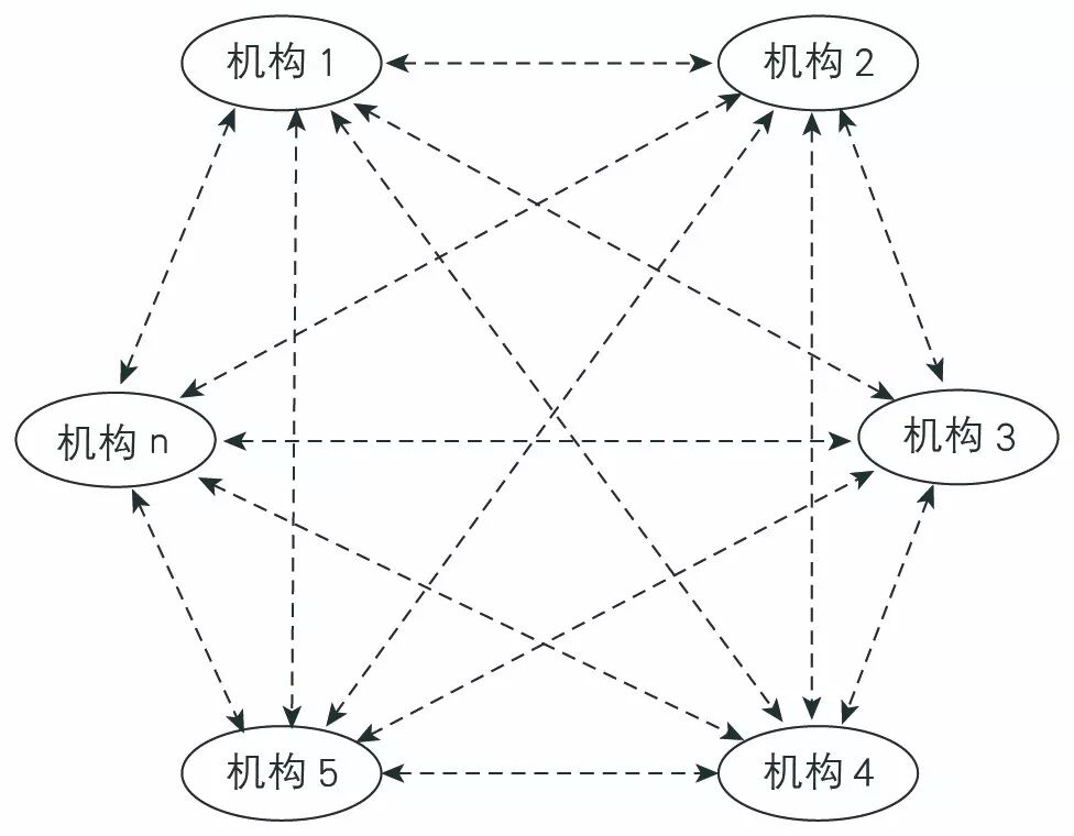 基于区块链构建多中心协同模式,可以促进多主体良性互动,改善政府信任。通过前面图1所述的点对点数据交换网络,某个信息能由某一节点通过点对点方式传输给其他单一或者多个节点,初步改善数据分享效果。图2为基于区块链构建的多中心协同模型,通过协同模式,信息上链后能够在该区块范围内迅速实现全网公开,区块链网络内每个节点可以随时、自由地查询到已上链的信息,无需再向某机构提出单独的查询信息申请,这样可以最大程度避免信息传递失真问题,大幅提高信息传递效率。该模式主要可以适用于两个场景:一是政府间各机构主体的多中心协同,通过各机构主体的共同讨论、协商等达成一致信息;二是广泛意义上的多中心参与或准去中心化,是社会各主体,包括公众、企业、各种组织等共同参与到公共事务的治理中,实现多元参与和共同决策。