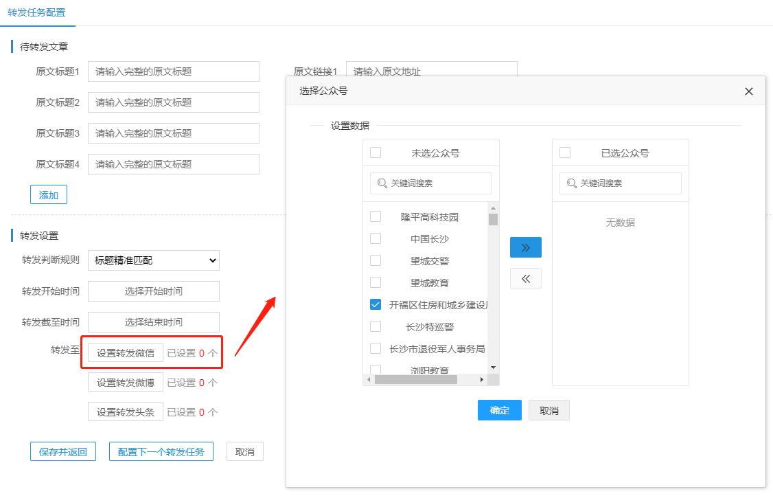 模块5:设置指定转发微信、微博及头条号。设置后,系统仅对已设置的新媒体的文章转发情况进行监测。点击设置按钮,如转发微信的设置按钮后,在下图中选择指定微信后,点击确定即可。