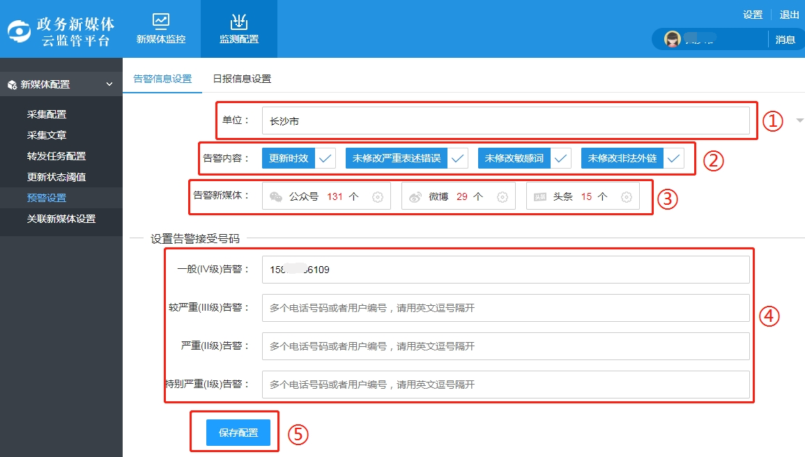 ”,分别设置该单位需要接收告警的微信、微博及头条。