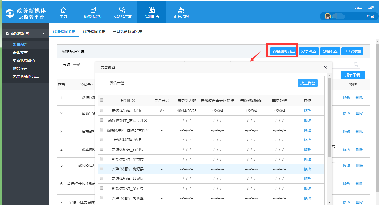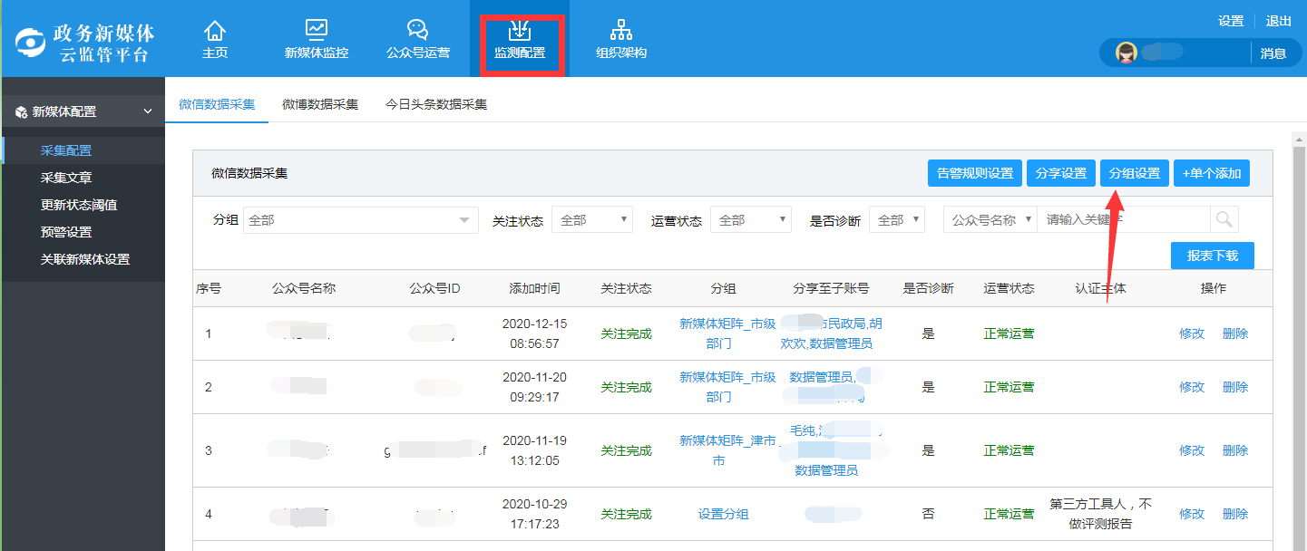 第一步:在“监测配置”/“采集配置”模块下设置好新媒体分组