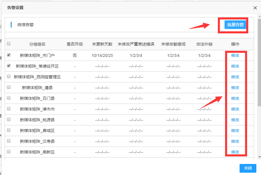 1、选中需多级告警的分组,点击修改(如果需批量修改,则多个选中,点击批量修改)。如下图: