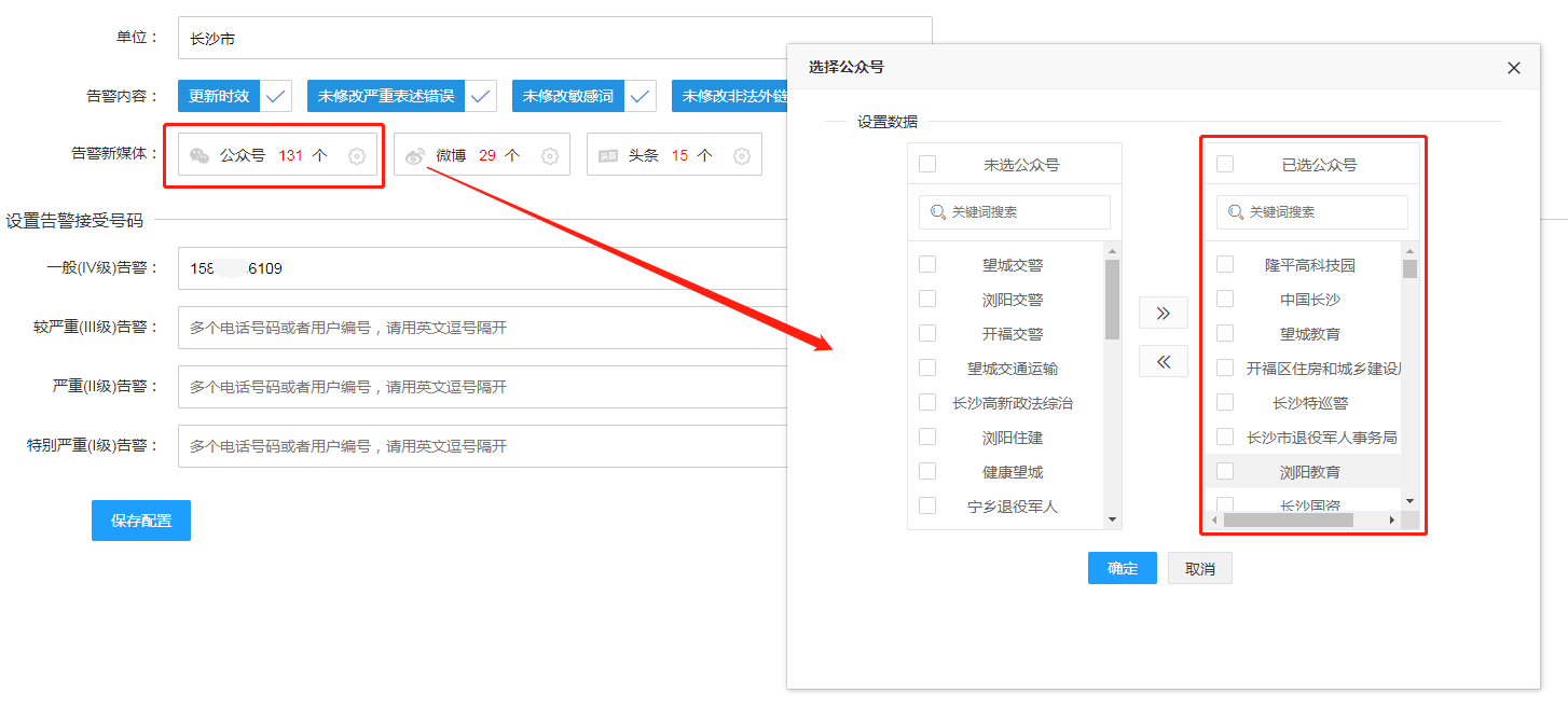 3.在模块③中,设置需要告警的公众号、微博、头条,只有选择了,系统才能对选择的新媒体进行告警。点击“