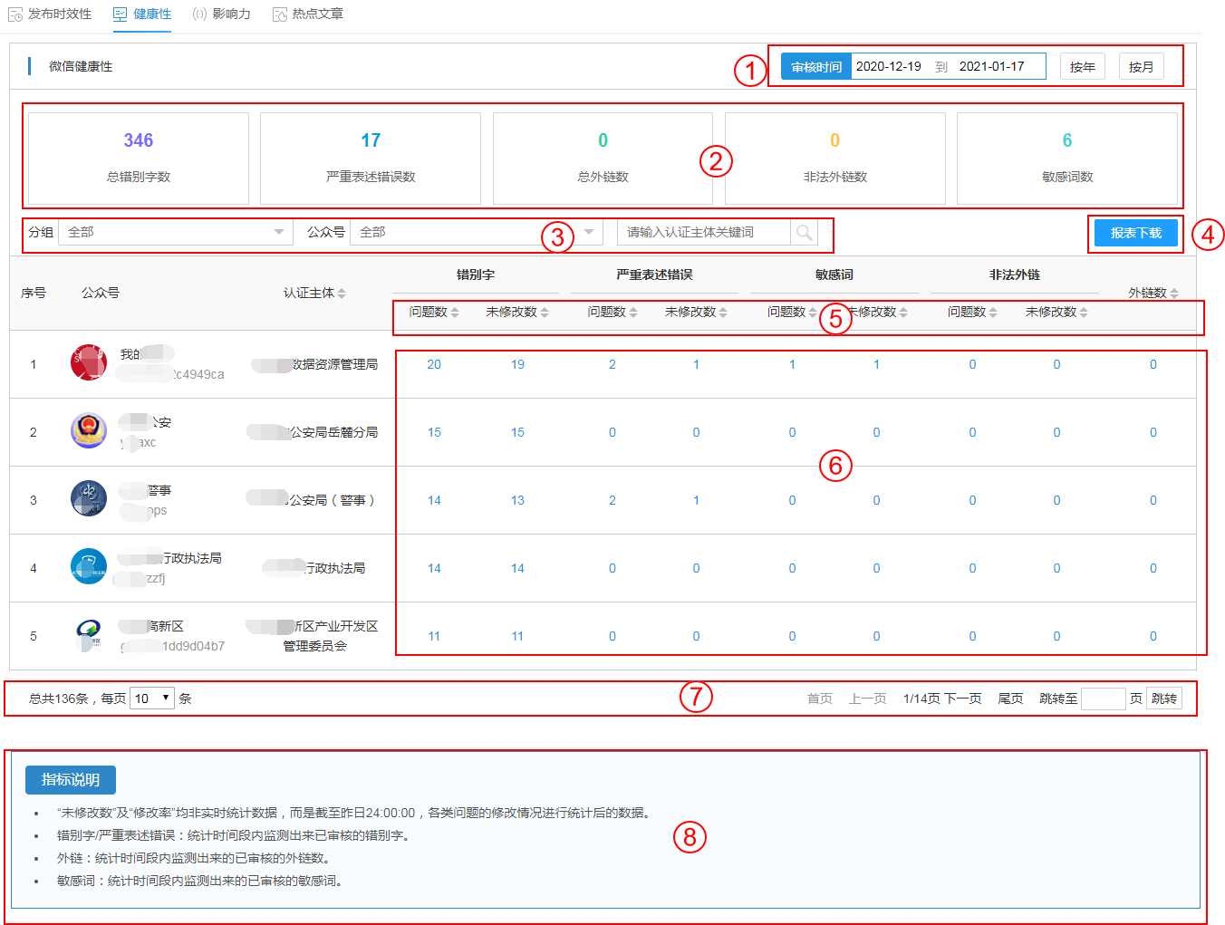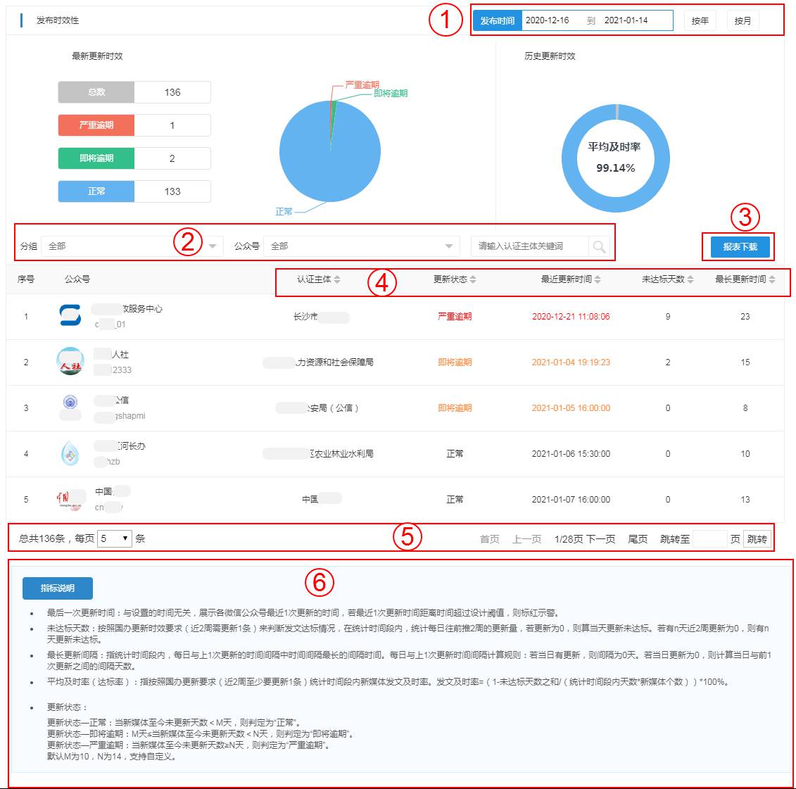 模块②:为统计数据,对应显示的是统计时间段内(可自由选择查询时间)新媒体的未达标天数、最长更新时间及发文及时率,此类指标用于评估新媒体在统计时间段内的内容保障程度。