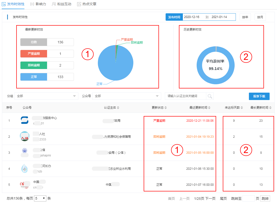 上图中,模块①:为实时数据,与统计时间段无关。模块对应显示的是实时监测到的新媒体最新更新状态及最近更新时间,便于用户据此判断新媒体最新更新是否逾期。更新状态的判断规则,支持用户自定义,具体自定义设置操作见:“更新状态阈值”。