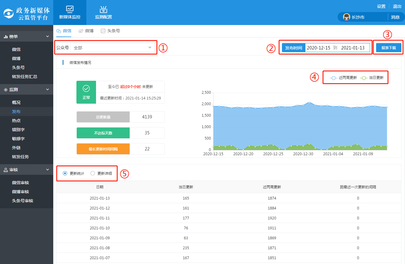 系统分类展示微信、微博、头条号的信息发布情况。用tab键实现三类新媒体内容发布模块的切换。各个新媒体发布模块操作类似,现以微信发布模块操作示例: