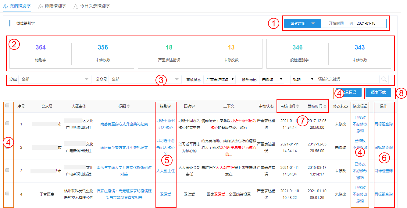 错别字监测模块主要展示人工审核确认后的微信公众号、微博及今日头条中的错别字。分tab展示微信、微博及头条号中的错别字,各子模块操作类似,现以微信错别字为例: