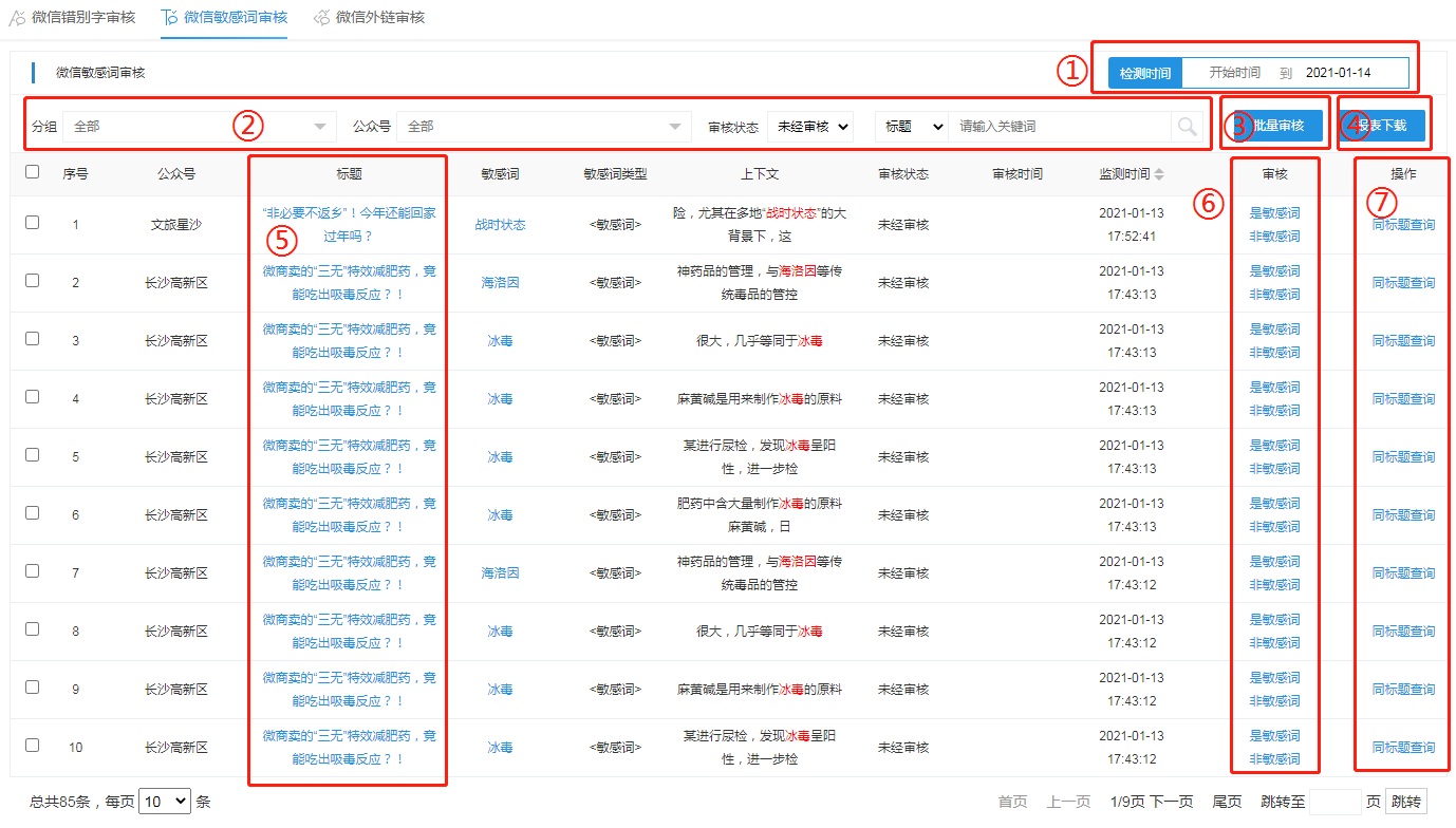 6. 在模块⑥中,点击“可信”、“非法”、“未经审核”可快速对单个敏感词进行审核。