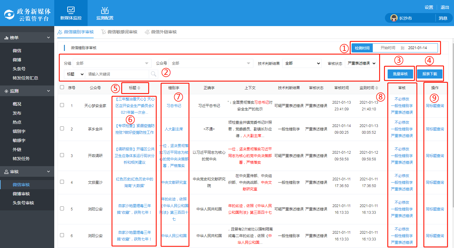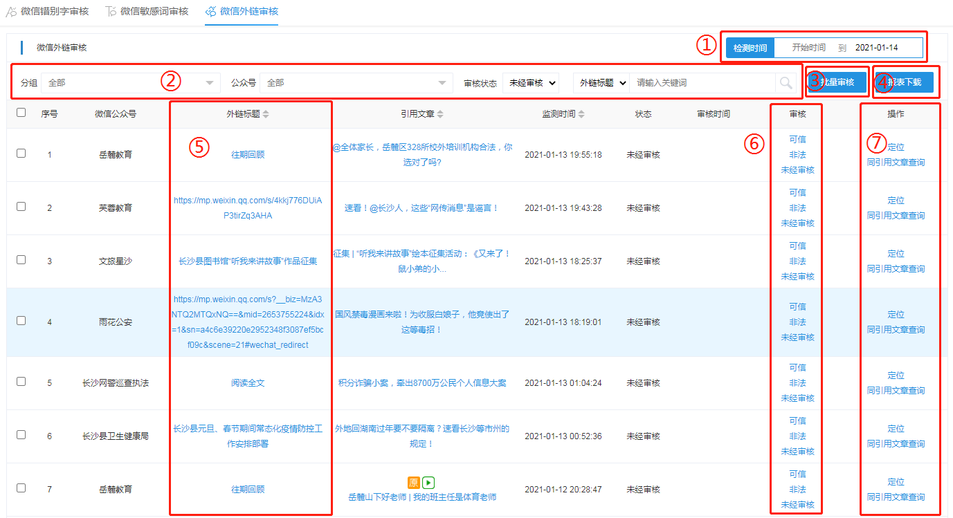 审核模块主要展示微信公众号、微博中技术监测到的错别字、敏感词及外链,并提供审核功能。